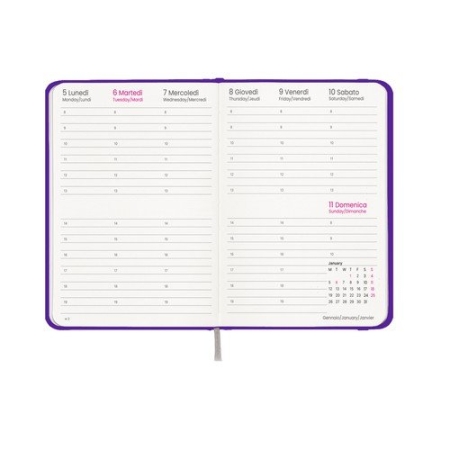 Agenda settimanale 2026, copertina rigida in cartoncino laminato. Con elastico per la chiusura. 12 mesi. 64 pagine in carta bianca da 70 g/m2. Dimensioni agenda 17,5x25,5 cm. La copertina è personalizzabile.