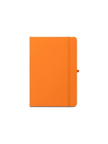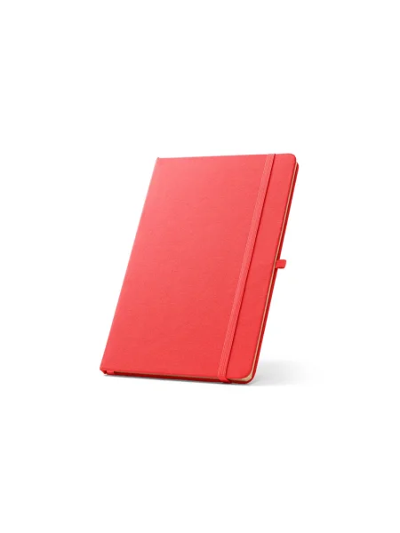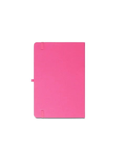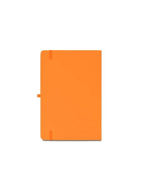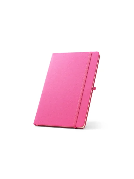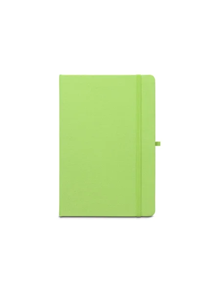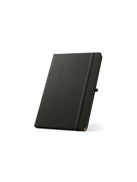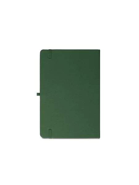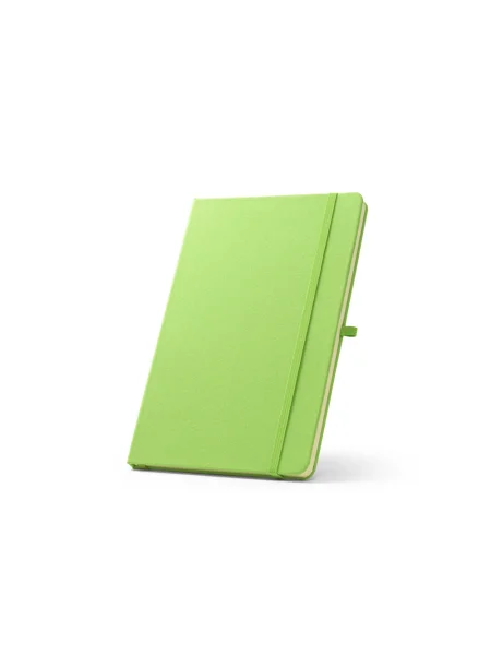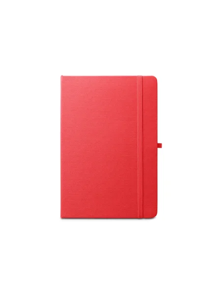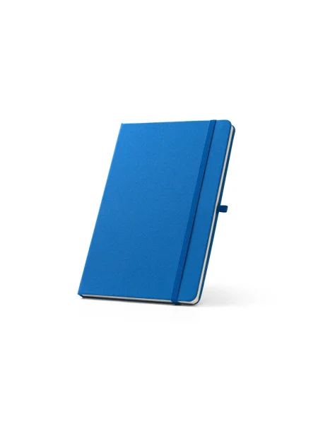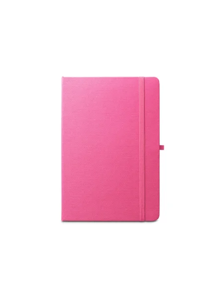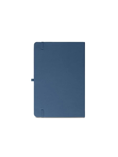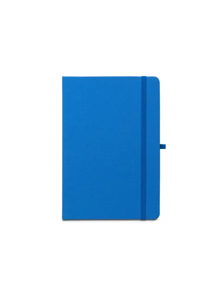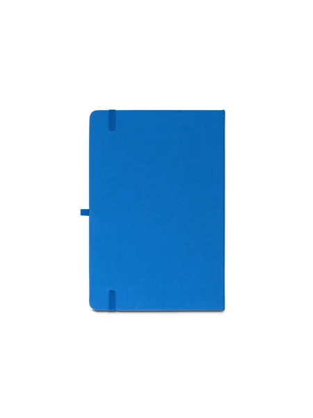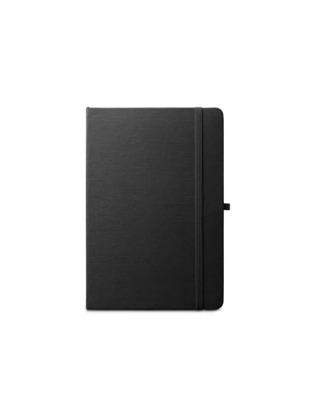 Block notes A5, con copertina rigida in poliestere riciclato (100% rPET) 300D e angoli arrotondati. Al suo interno 160 pagine a righe in carta color avorio 100% riciclata, nastro separatore, porta penna a sfera (non inclusa) ed elastico. Nella parte inferiore del dorso, è stampato in bianco il simbolo rPET. 143 x 211 mm