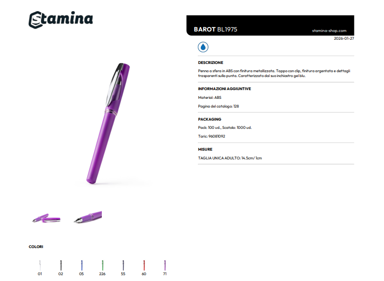 Penna a sfera in ABS con finitura metallizzata. Tappo con clip, finitura argentata e dettagli trasparenti sulla punta. Caratterizzato dal suo inchiostro gel blu.