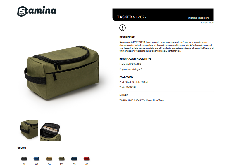 Necessaire in RPET 600D. Lo scomparto principale presenta un'apertura superiore con chiusura a zip che include una tasca interna in mesh con chiusura a zip. All'esterno è dotato di una tasca frontale con zip invisibile che offre ulteriore spazio per riporre gli oggetti. Dispone di un manico per il trasporto sul lato per un uso più confortevole.