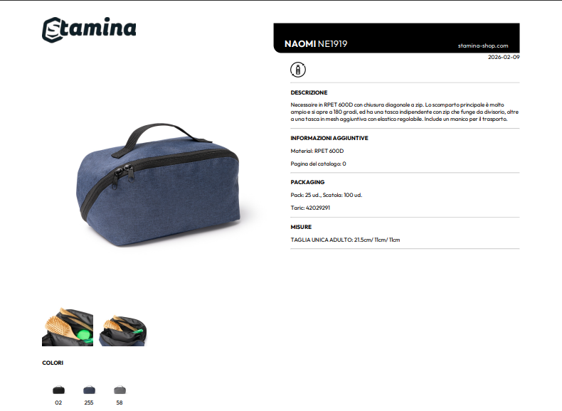 Necessaire in RPET 600D con chiusura diagonale a zip. Lo scomparto principale è molto ampio e si apre a 180 gradi, ed ha una tasca indipendente con zip che funge da divisorio, oltre a una tasca in mesh aggiuntiva con elastico regolabile. Include un manico per il trasporto.