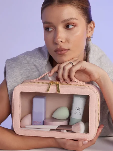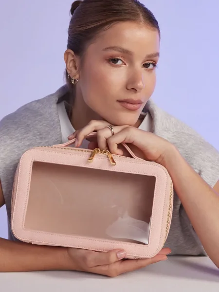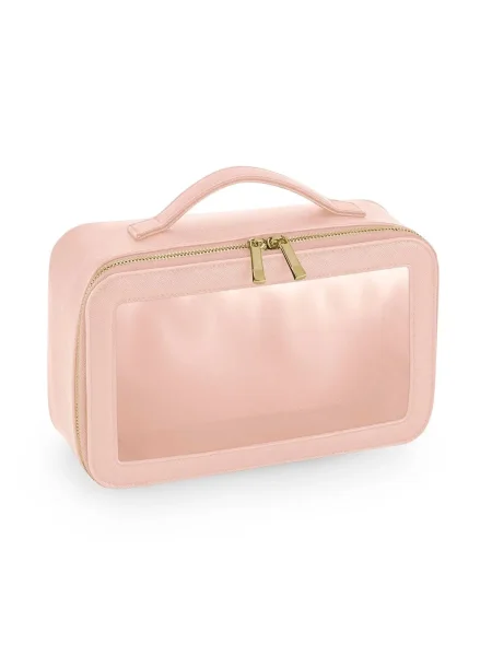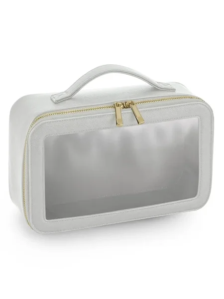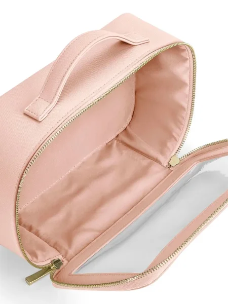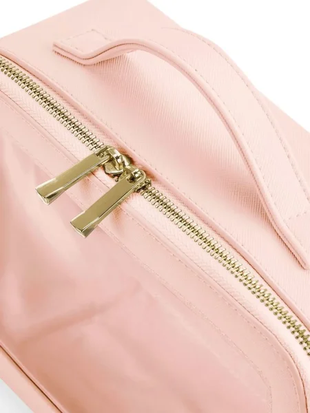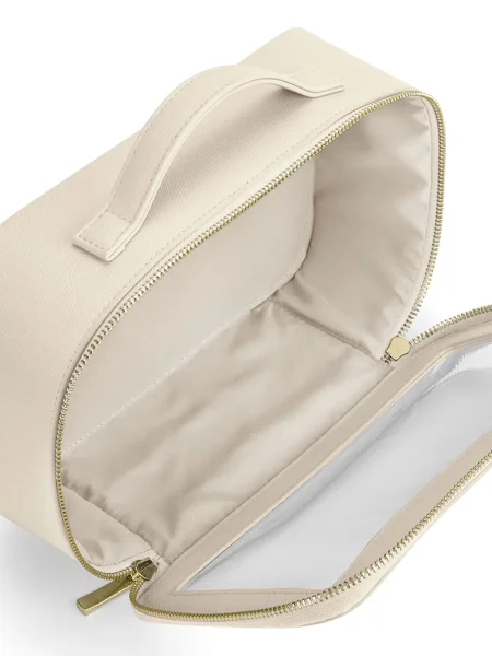Beauty case da donna realizzato in saffiano a grana fine, versatile e adatto a molteplici utilizzi. Dispone di uno scomparto principale con chiusura a zip e pannello trasparente, rivestito con un materiale morbido al tatto. La cerniera è in metallo dorato lucido, mentre il manico in tessuto rende facile il trasporto. Completa il design un'etichetta removibile.