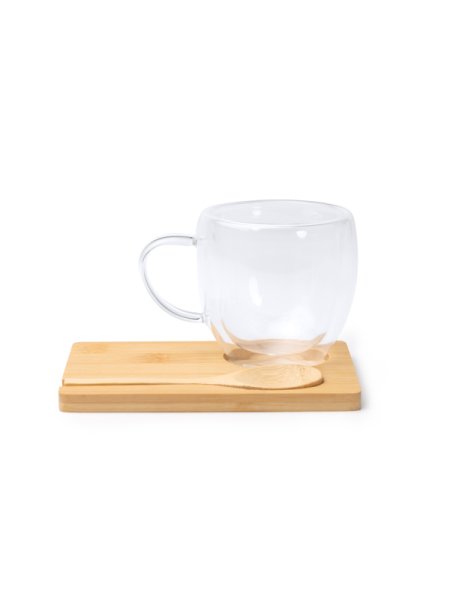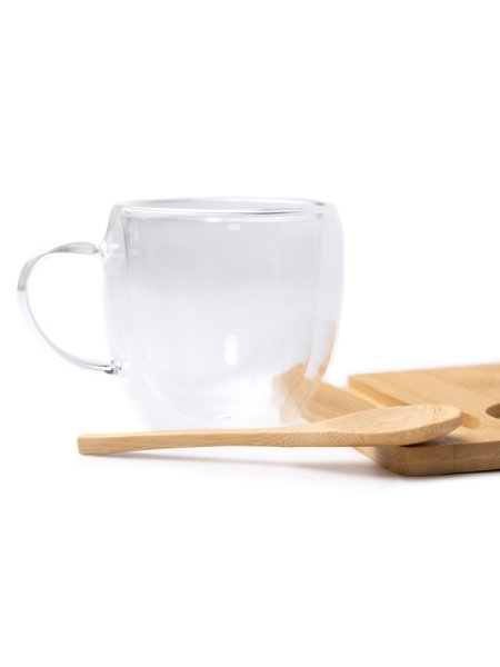 Set composto da tazza in vetro borosilicato a doppia parete, sottobicchiere rettangolare e cucchiaio in bambù. La doppia parete della tazza garantisce isolamento termico, rendendola più comoda da usare. Capacità fino a 250 ml.