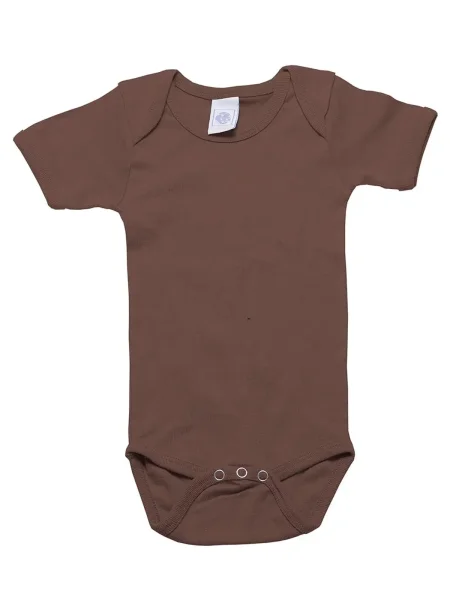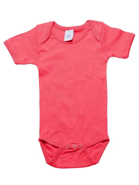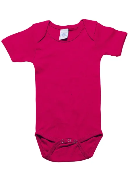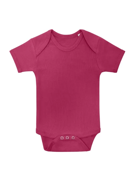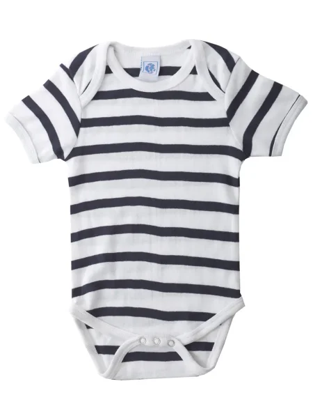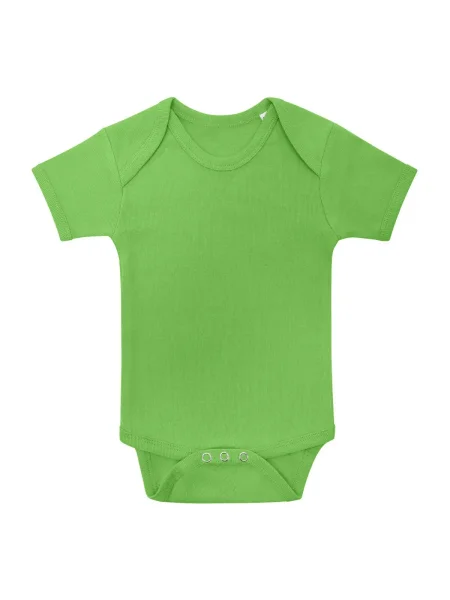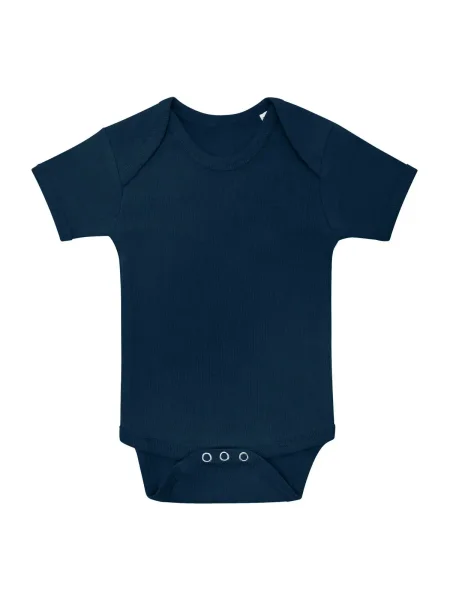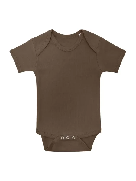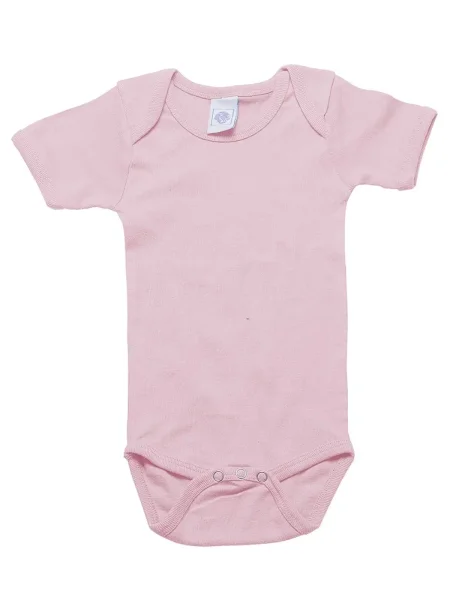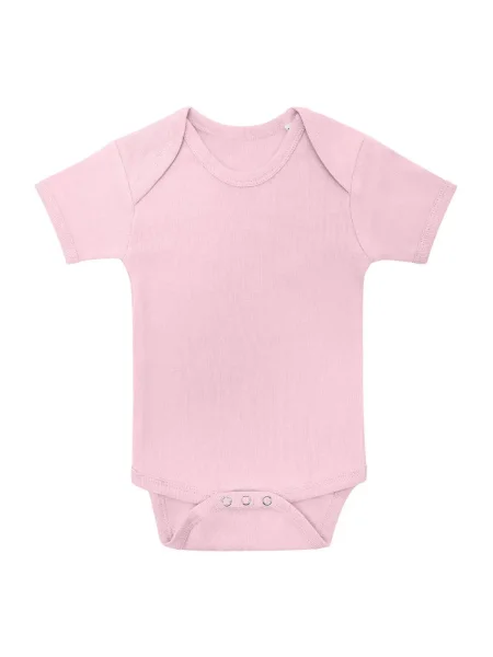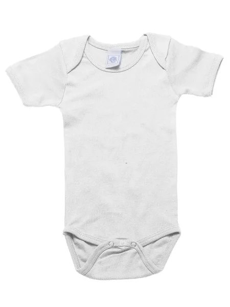 Body per neonato maniche corte, orli in costina 1x1, struttura con cuciture laterali. Etichetta taglia al collo, etichetta composizione nel fianco del busto.