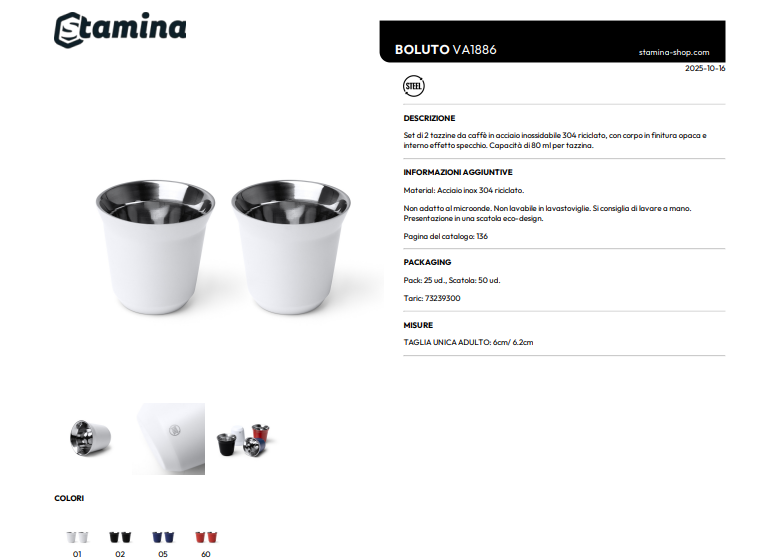 IL TUO PREVENTIVO    Set di 2 tazzine da caffè in acciaio inox 304 riciclato BOLUTO