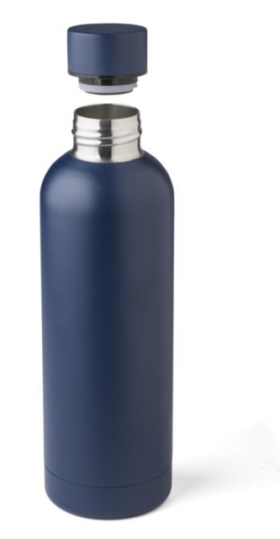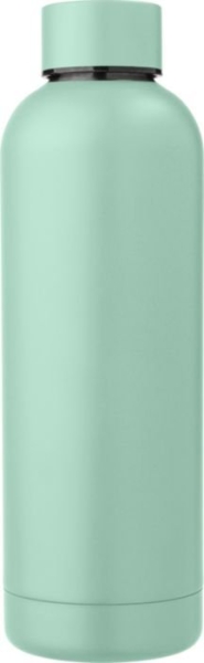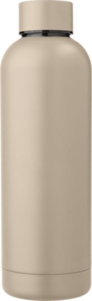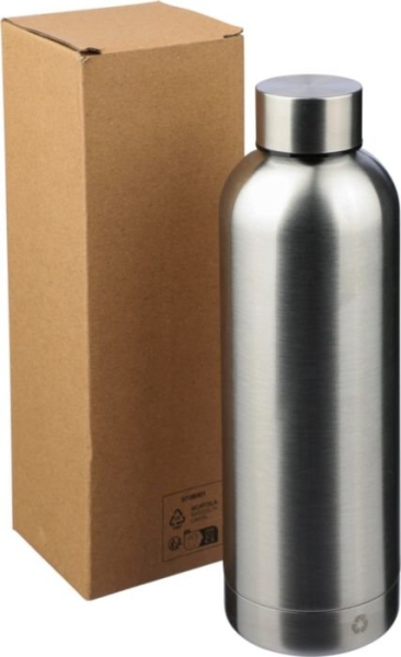 Borraccia in acciaio inox 304 riciclato con doppia parete isolante, ideale per mantenere la temperatura delle bevande calde o fredde più a lungo. La superficie presenta una finitura opaca elegante e piacevole al tatto, ad eccezione della versione argento, che si distingue per la sua finitura standard lucida. Capacità 500 ml, confezionata singolarmente in una scatola in cartone avana ecologico