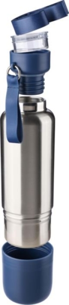 Borraccia in acciaio inox riciclato a doppia parete, con interno in acciaio inox 304 ed esterno in acciaio inox 201, corpo in argento con dettagli opachi, capacità 500 ml, include tappo a vite con vano incorporato in AS trasparente, due nastri intercambiabili per in facile trasporto composto da cordino da polso e tracolla, bicchiere incorporata sul fondo in PP capacità 200 ml, confezionata singolarmente in una scatola di cartone avana.