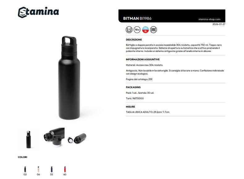 Bottiglia a doppia parete in acciaio inossidabile 304 riciclato, capacità 750 ml. Tappo nero con impugnatura incorporata. Sistema di apertura automatica che si attiva premendo il pulsante interno. Include un sistema antigoccia grazie all'anello interno in silicone.