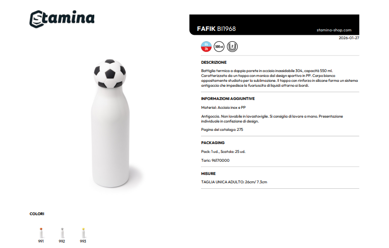 Bottiglia termica a doppia parete in acciaio inossidabile 304, capacità 550 ml. Caratterizzata da un tappo con manica dal design sportivo in PP. Corpo bianco appositamente studiato per la sublimazione. Il tappo con rinforzo in silicone forma un sistema antigoccia che impedisce la fuoriuscita di liquidi attorno ai bordi.