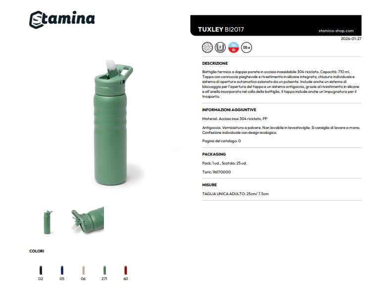 Bottiglia termica a doppia parete in acciaio inossidabile 304 riciclato. Capacità: 710 ml. Tappo con cannuccia pieghevole e rivestimento in silicone integrato, chiusura individuale e sistema di apertura automatico azionato da un pulsante. Include anche un sistema di bloccaggio per l'apertura del tappo e un sistema antigoccia, grazie al rivestimento in silicone e all'anello incorporato nel collo della bottiglia. Il tappo include anche un'impugnatura per il trasporto.