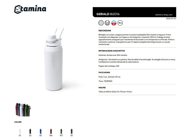 Bottiglia con corpo a doppia parete in acciaio inossidabile 304 riciclato e tappo in Tritan traslucido con dispenser con tappo a vite integrato. Capacità: 500 ml. Il design è stato appositamente sviluppato per mantenere le bevande a una temperatura ottimale. Finitura verniciata a polvere. Impugnatura per il trasporto pieghevole integrata per un uso più confortevole.