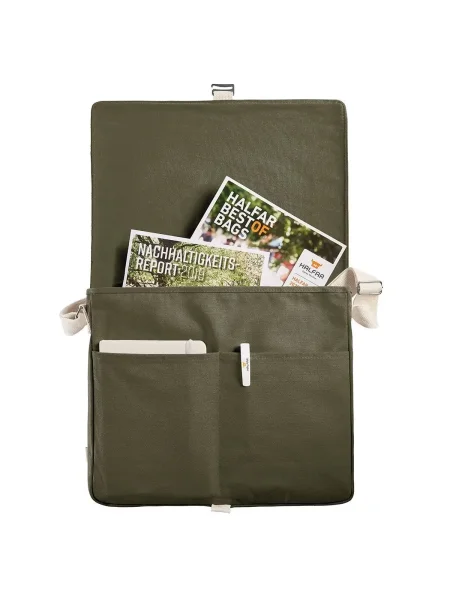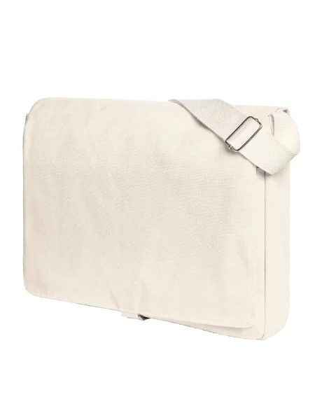 Borsa documenti a tracolla con chiusura a clip, ampio scomparto principale, ideale anche per documenti A4, due tasche a inserto piatte sul lato anteriore, passante di fissaggio sul retro per l'asta del trolley, spallaccio in cotone regolabile in lunghezza. Dimensioni: 37x31x7 cm, area di stampa sul davanti: 26 x 20 cm.