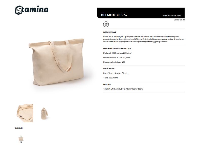 Borsa 100% cotone (230 g/m²) con soffietti sulla base e sui lati che rendono facile riporvi qualsiasi oggetto. I manici sono lunghi 70 cm. Dotata di chiusura superiore a zip e di una tasca interna che la rende più pratica e sicura per trasportare oggetti personali.
