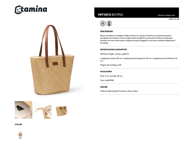 Borsa con esterno in paglia e fodera interna in cotone. Presenta un ampio scomparto principale con chiusura a zip e lunghi manici in pelle PU, entrambi in finitura coordinata. Include una tasca interna per trasportare piccoli oggetti e una zona anteriore ideale per il branding.