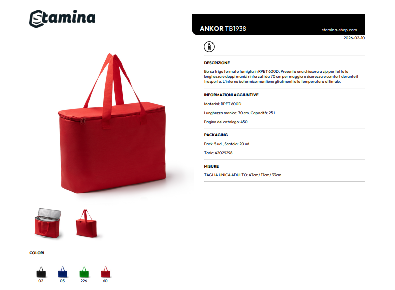 Borsa frigo formato famiglia in RPET 600D. Presenta una chiusura a zip per tutta la lunghezza e doppi manici rinforzati da 70 cm per maggiore sicurezza e comfort durante il trasporto. L'interno isotermico mantiene gli alimenti alla temperatura ottimale.
