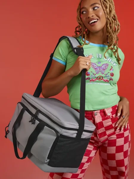 Borsa frigo rigida personalizzata, realizzata senza PVC e BPA, con fodera in PEVA. Dotata di scomparto principale completamente isolato con chiusura a zip, interno lavabile e tasca frontale con zip. Include porta bottiglie o blocco di ghiaccio, due manici per il trasporto e una tracolla regolabile in tessuto. Rifinita con tirazip in cordoncino con dettagli riflettenti e un'etichetta removibile.
