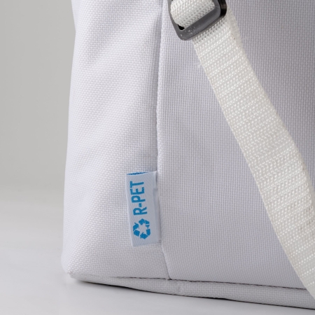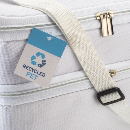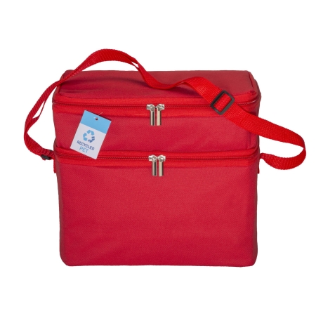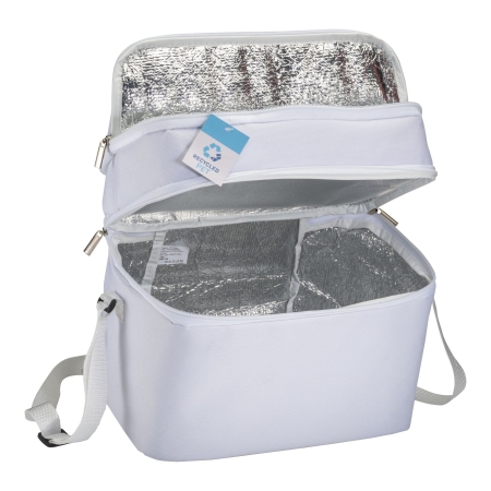 Borsa termica personalizzata ecosostenibile realizzata in R-PET, un materiale riciclato che contribuisce alla salvaguardia dell’ambiente. Dotata di interno argentato con isolamento termico, mantiene la temperatura ideale di cibi e bevande più a lungo. Il design funzionale include due scomparti separati con chiusura a zip.