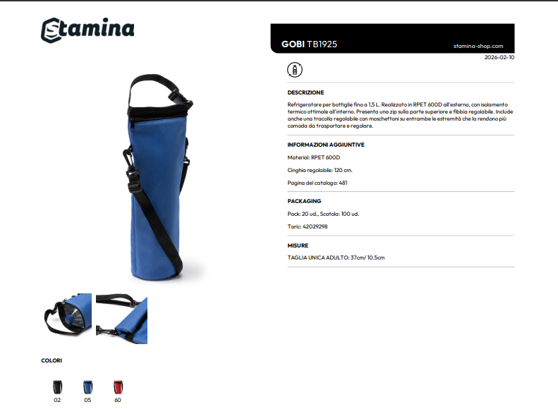Refrigeratore per bottiglie fino a 1,5 L. Realizzato in RPET 600D all'esterno, con isolamento termico ottimale all'interno. Presenta una zip sulla parte superiore e fibbia regolabile. Include anche una tracolla regolabile con moschettoni su entrambe le estremità che la rendono più comoda da trasportare e regolare.