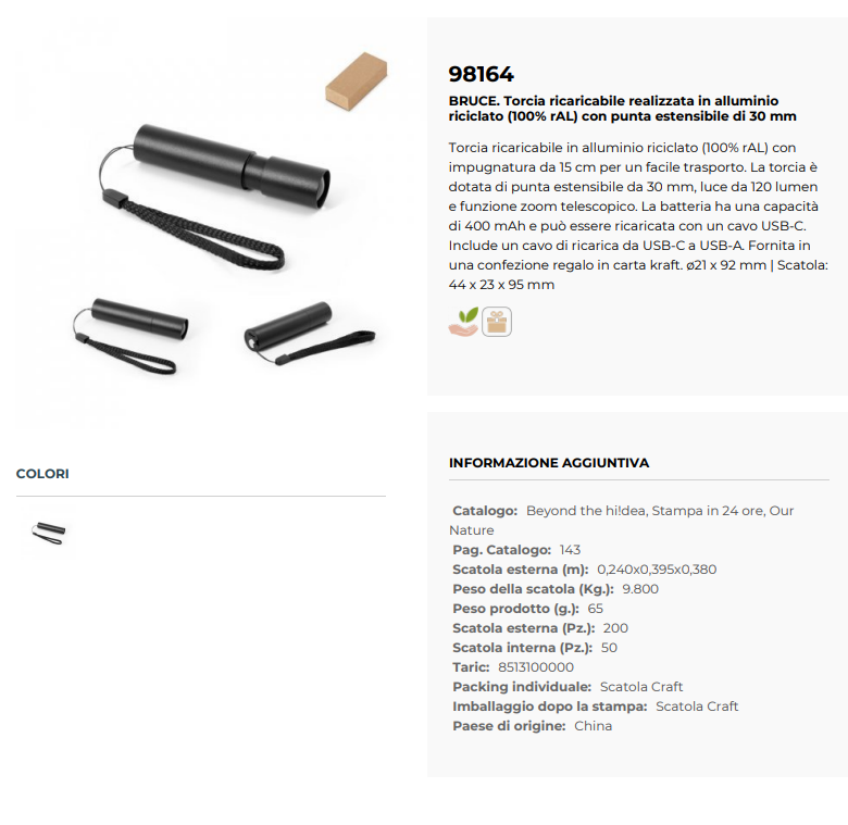 Torcia ricaricabile in alluminio riciclato con zoom e luce 120 lumen BRUCE