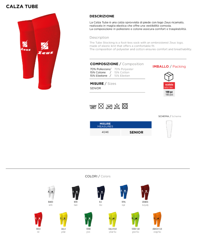 La Calza Tube Zeus è una calza senza piede realizzata in maglia elastica che garantisce una vestibilità comoda e aderente Ideale per completare l’abbigliamento sportivo è dotata di logo Zeus ricamato che ne valorizza il design La composizione in poliestere e cotone assicura comfort traspirabilità e resistenza durante l’attività fisica rendendola perfetta per allenamenti e competizioni