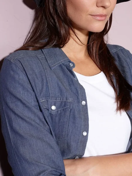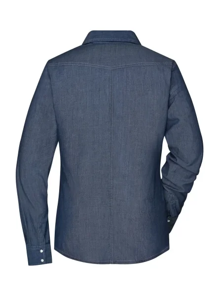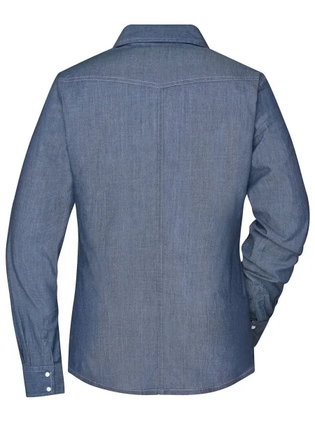 Camicia donna in tessuto denim, sprone classico sul retro, due taschine interne, impunture marcate, orlo arrotondato. Leggermente sfiancata ai lati.