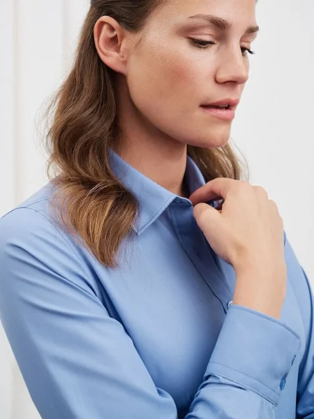 Camicia poplin easy care, con orlo arrotondato, taglio femminile leggermente sfiancato ai lati.