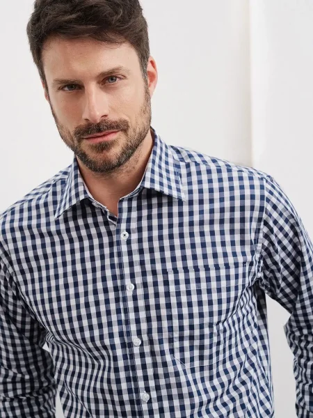 Camicia fashion a quadri con inserti in tinta unita sul colletto e polsini. Tessuto in popeline di alta qualità, stiro facile, orlo arrotondato, taglio classico leggermente avvitato tasca sul petto.