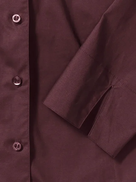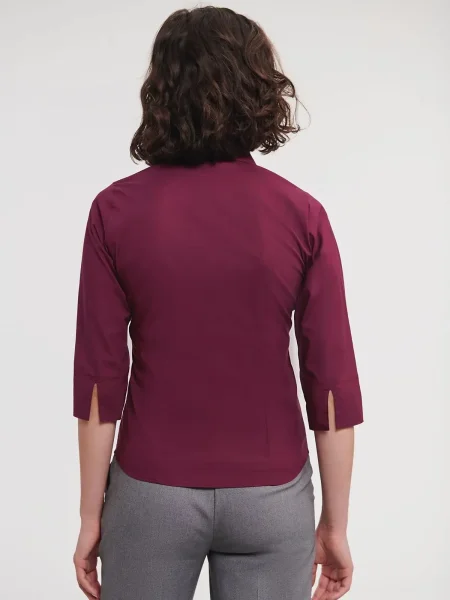 Camicie donne eleganti personalizzate manica 3/4 Rusell, colletto semiaperto con bottone singolo perlato, orlo stondato. Manica 3/4 con spacchetto e risvolto. Pince dietro e davanti al seno per una vestibilità femminile. Bottone di riserva.