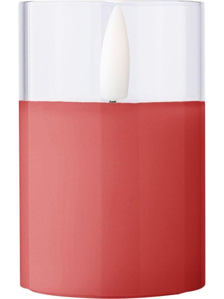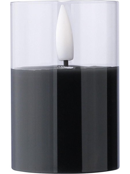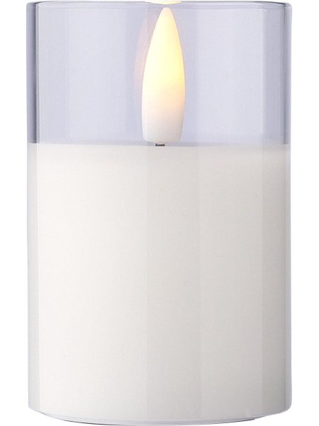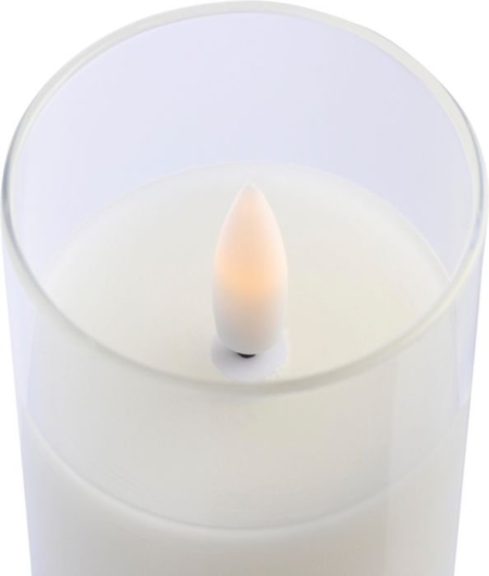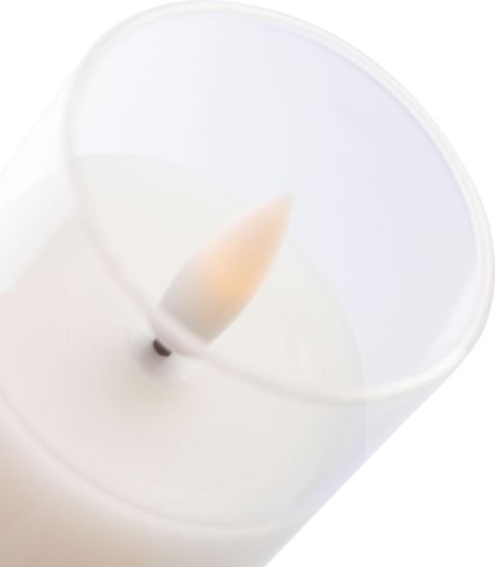 Candela LED in cera con supporto in vetro e effetto fiamma realistica, include batteria ed offre un’autonomia di circa 100 ore, progettata per uso interno, confezionata singolarmente in una scatola di cartone avana.