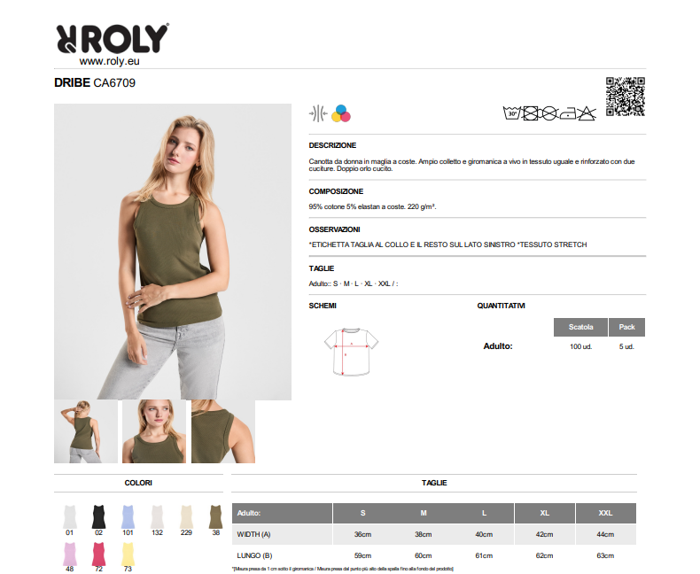 Canotta da donna in maglia a coste. Ampio colletto e giromanica a vivo in tessuto uguale e rinforzato con due cuciture. Doppio orlo cucito.