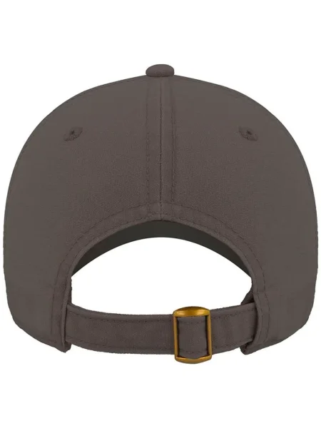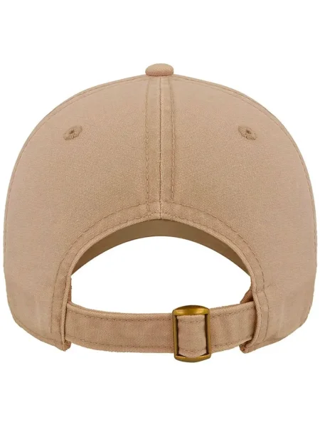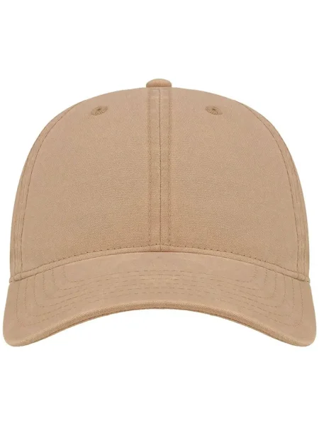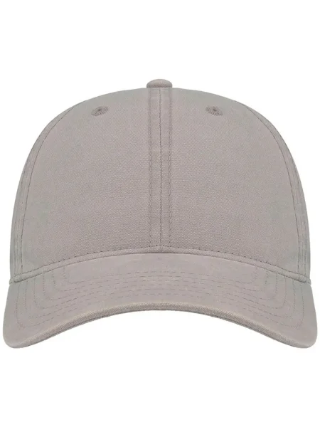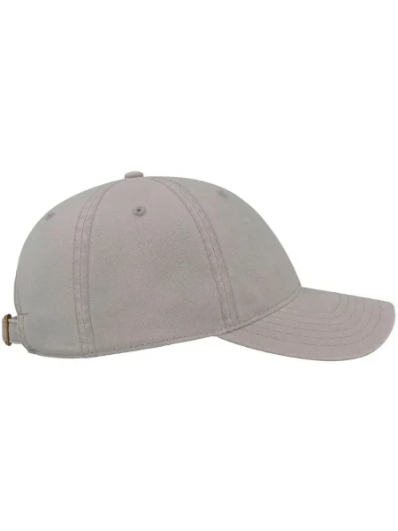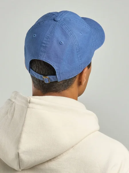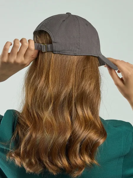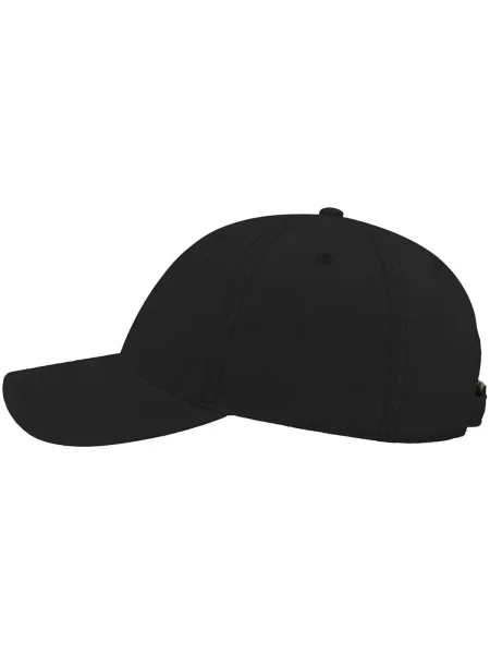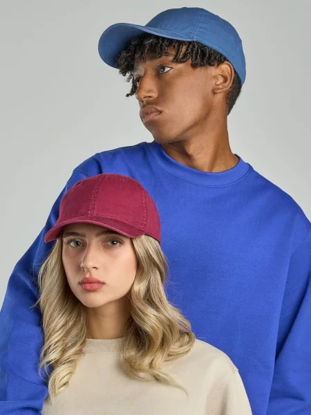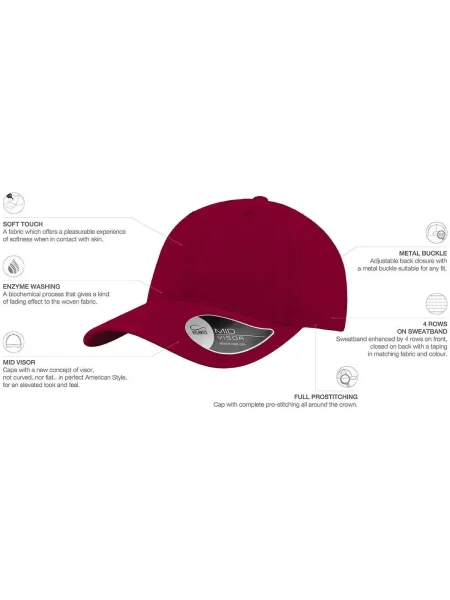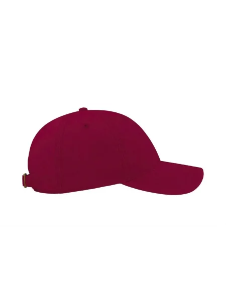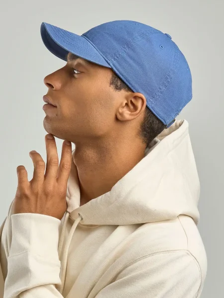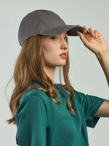 Cappellino a 6 pannelli dal look vintage con tessuto effetto lavato. Visiera precurvata, occhielli ricamati, 6 cuciture sulla visiera, chiusura con fibbia in metallo.