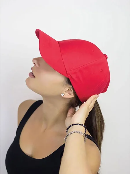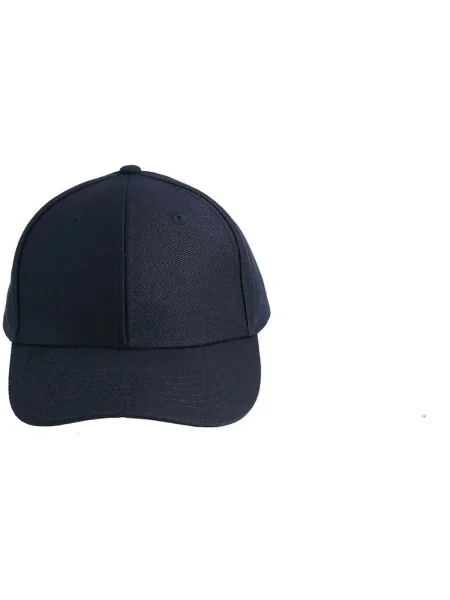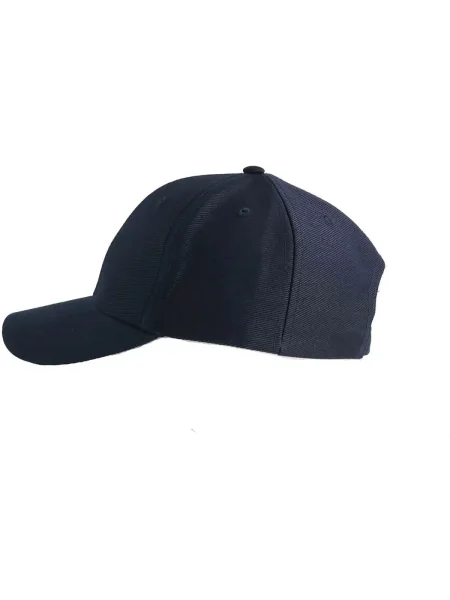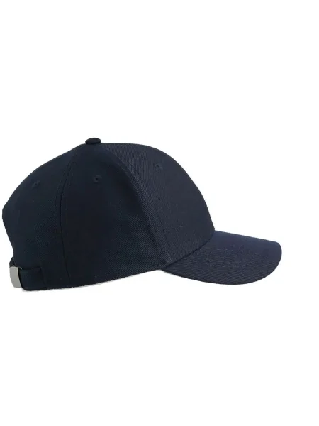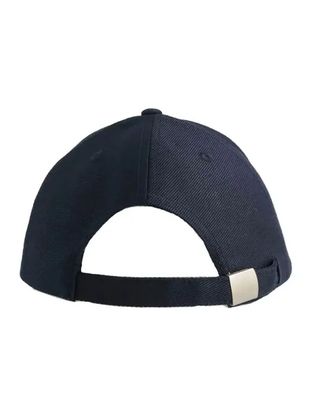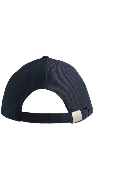 Cappellino a 6 pannelli, occhielli ricamati, pannello frontale rinforzato, visiera pre-curvata, chiusura con fibbia e foro cucito, 6 cuciture su visiera, parasudore in cotone.