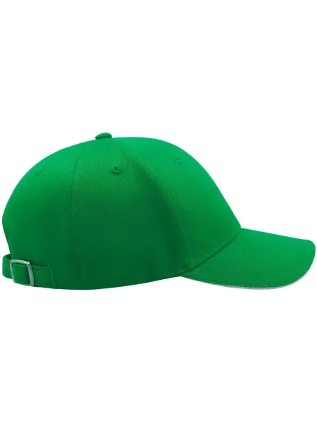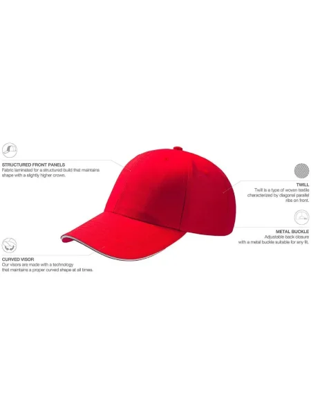 Cappello da baseball realizzato in twill 100% cotone, resistente e confortevole al tatto. Caratterizzato da una visiera pre-curvata con dettaglio sandwich a contrasto, aggiunge un tocco di stile al design classico. La chiusura con cinturino in tessuto e fibbia metallica assicura una vestibilità regolabile e sicura. Un accessorio versatile, ideale per il tempo libero, eventi o attività promozionali.