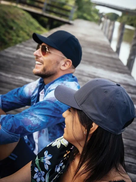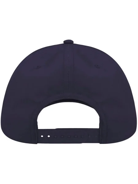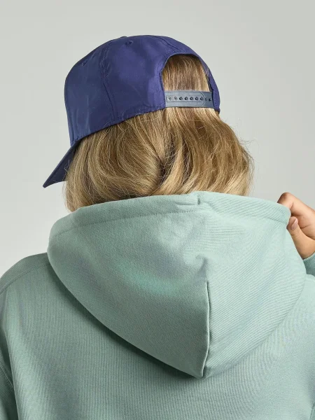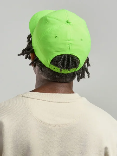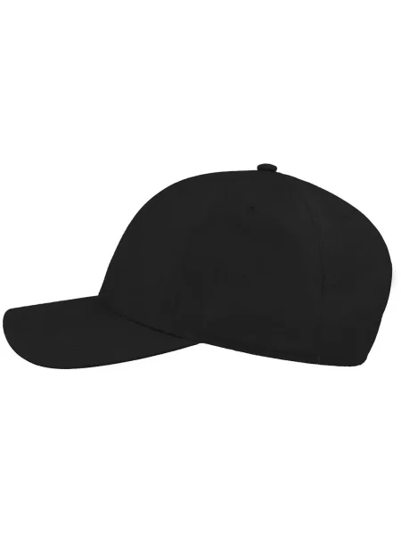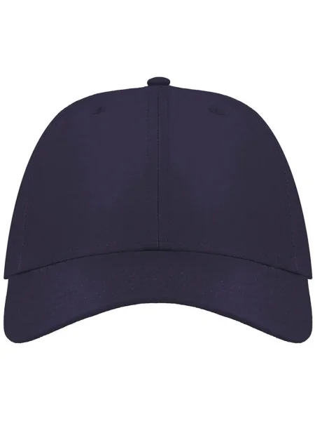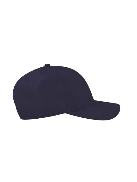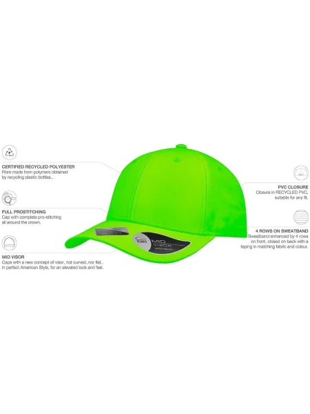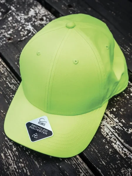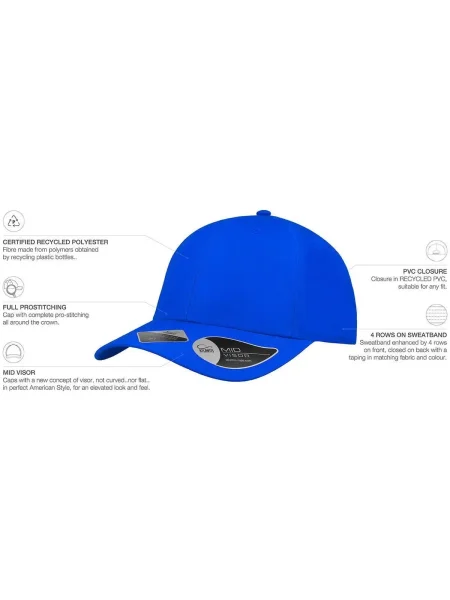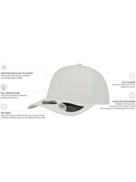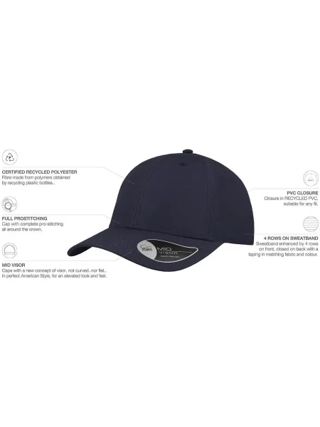 Cappellino realizzato grazie all'utilizzo di undici bottiglie di plastica riciclata per metro quadro. 6 pannelli, visiera precurvata, occhielli ricamati, 6 cuciture sulla visiera, chiusura in PVC.