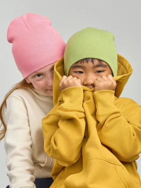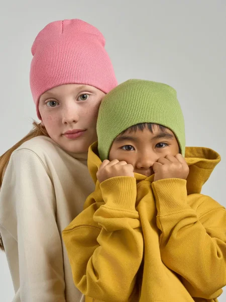 Berretto bambino 100% cotone biologico certificato, naturalmente anallergico e delicato sulla pelle. Lavorato a coste strette con macchina circolare, offre comfort, traspirabilità e una vestibilità perfetta.