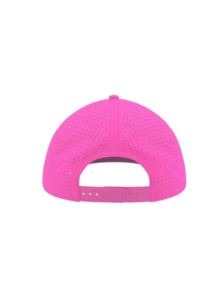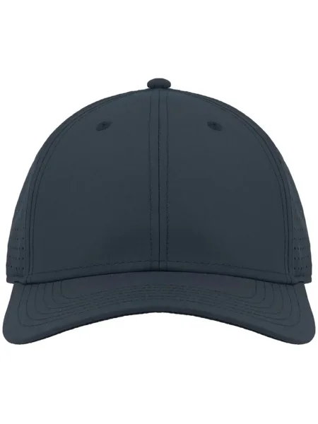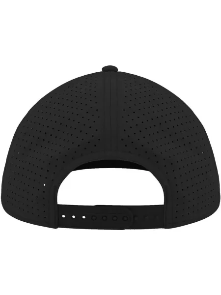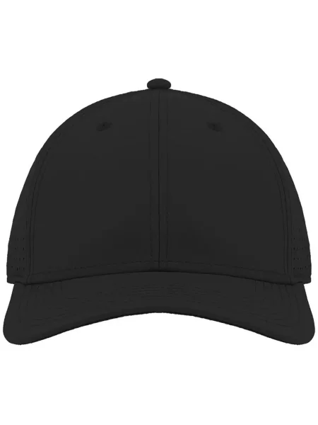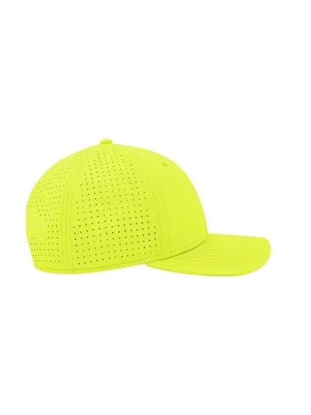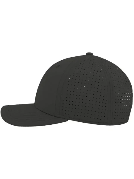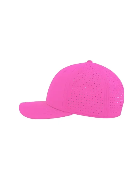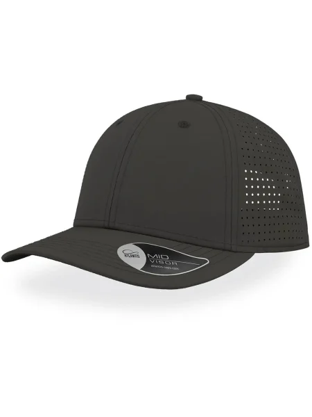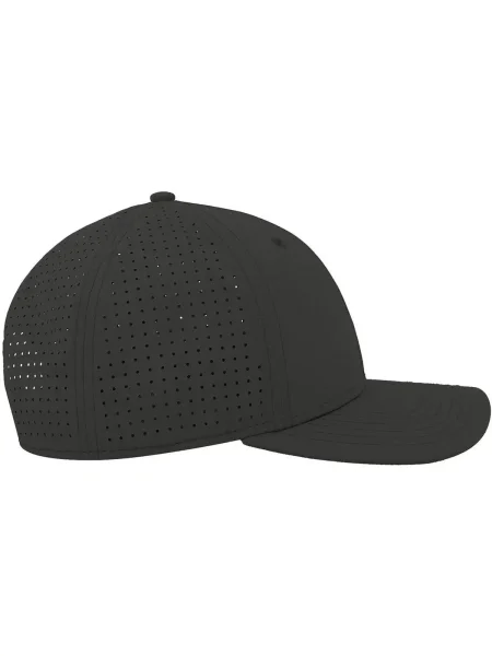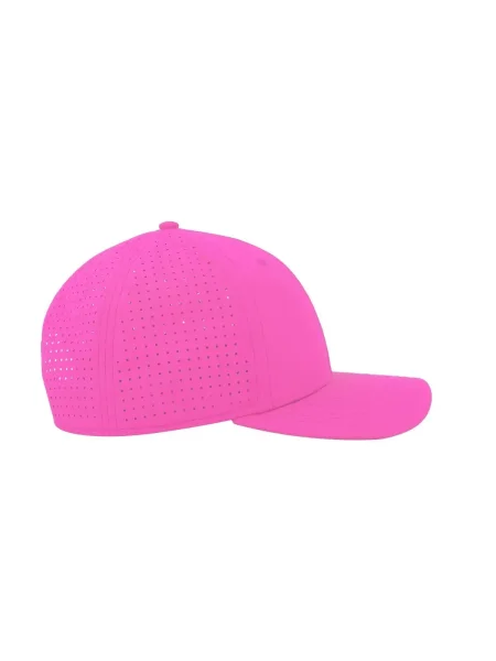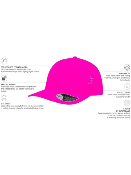Cappellino a 6 pannelli con corona traforata e fascia in tessuto 3D che lo rendono fresco e asciutto. Visiera precurvata, occhielli ricamati, 6 cuciture sulla visiera, chiusura in PVC.