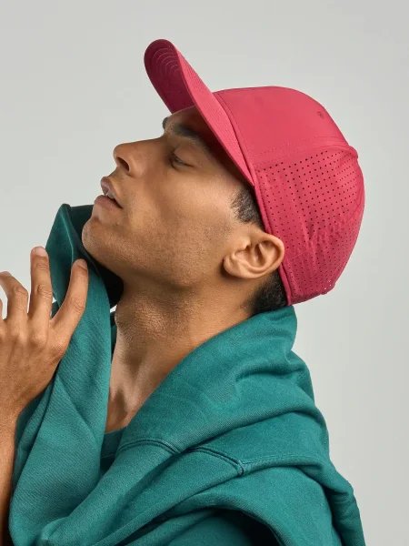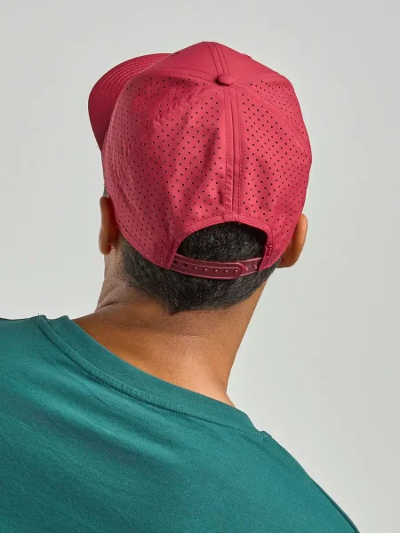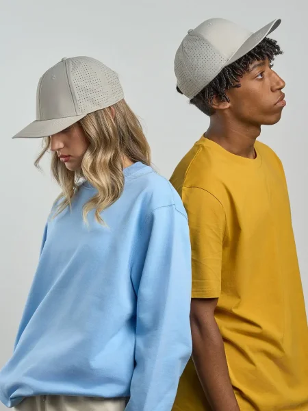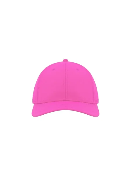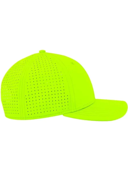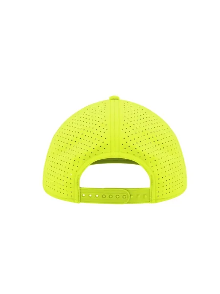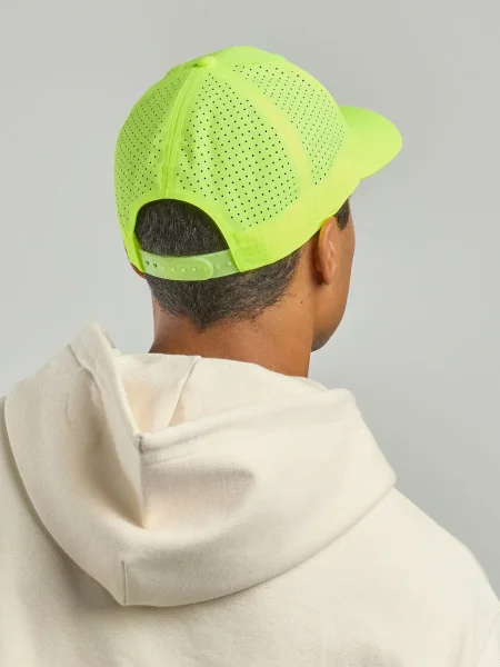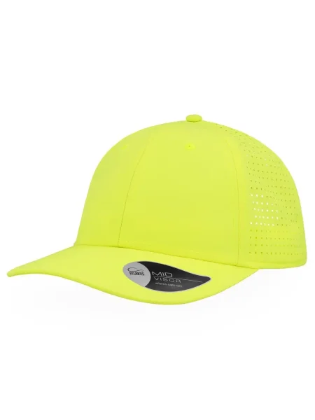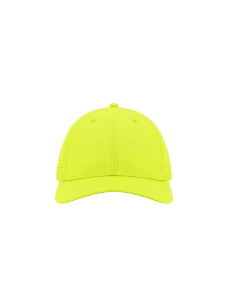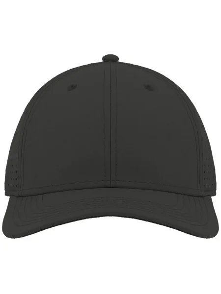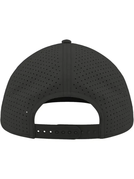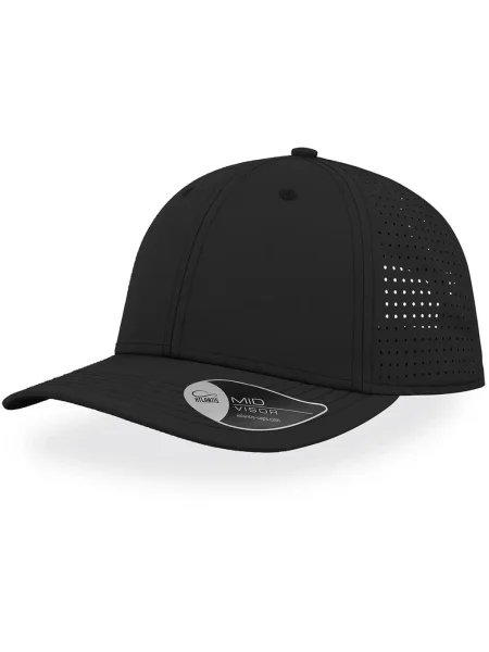 Cappellino a 6 pannelli con corona traforata e fascia in tessuto 3D che lo rendono fresco e asciutto. Visiera precurvata, occhielli ricamati, 6 cuciture sulla visiera, chiusura in PVC.