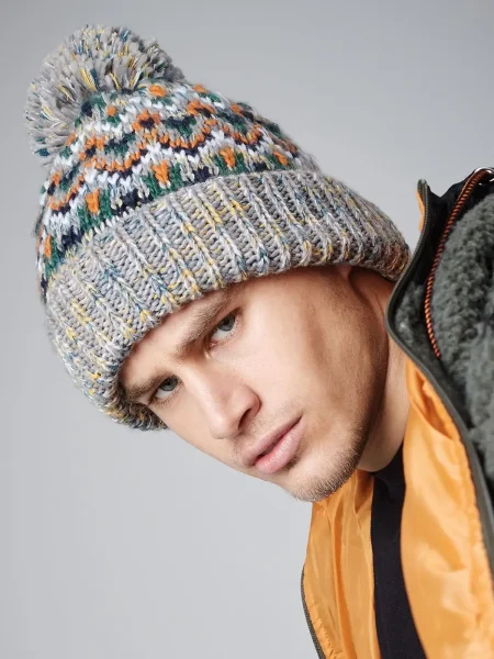 Cuffia con motivo geometrico, modello con risvolto, pon-pon colorato, taglia unica. 100% acrilico soft-spun, fodera: