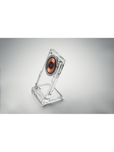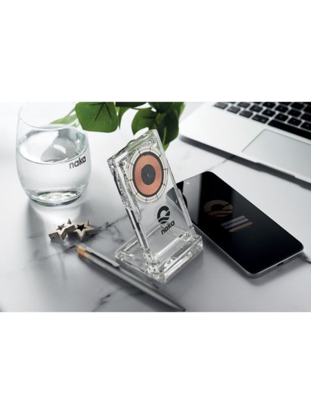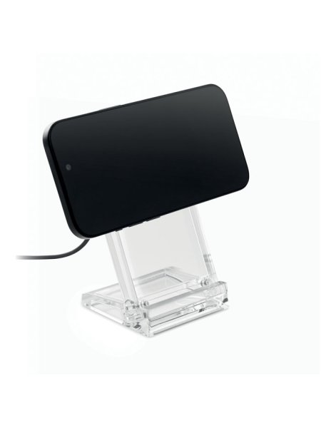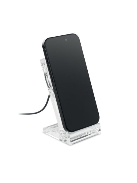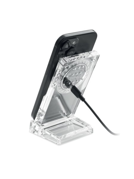 Caricatore wireless 15W in acrilico con supporto integrato per telefono, progettato per offrire praticità e velocità di ricarica. Una volta collegato a una fonte di alimentazione, consente di ricaricare il dispositivo mobile senza fili. Fornisce un’uscita di 9V/1,67A (15W), ideale per la ricarica rapida.