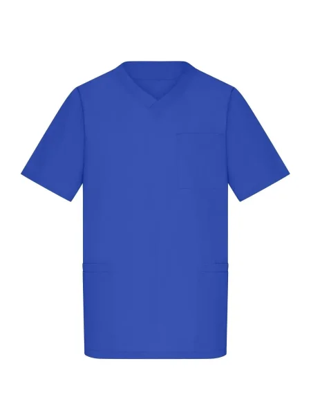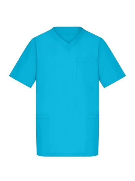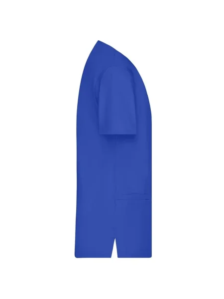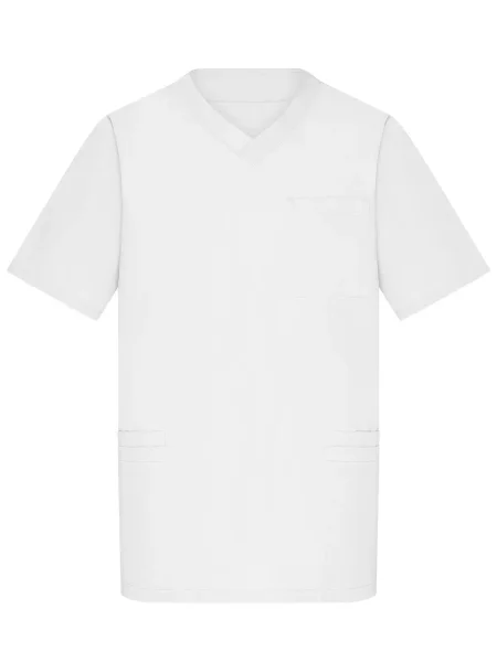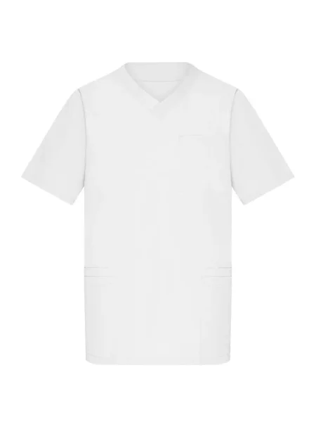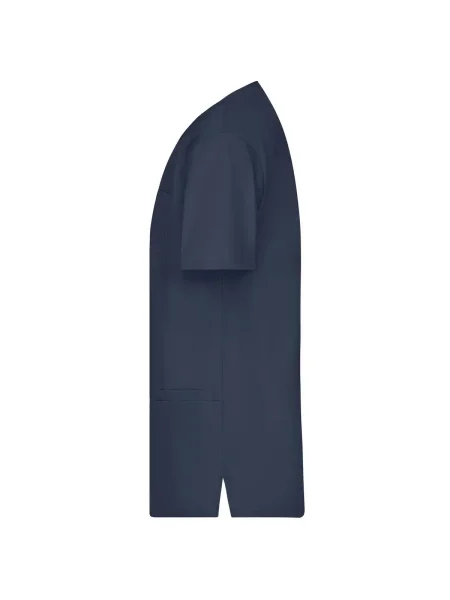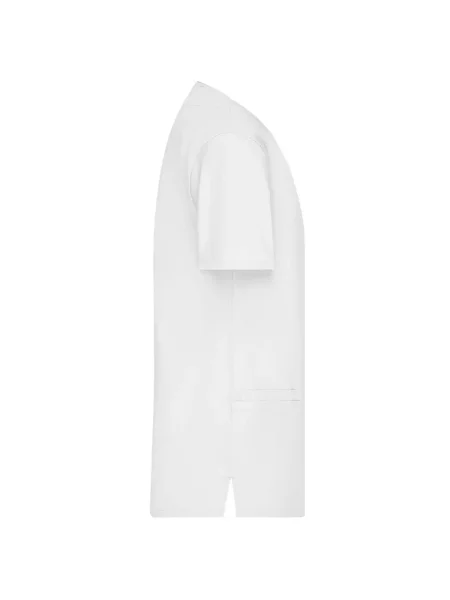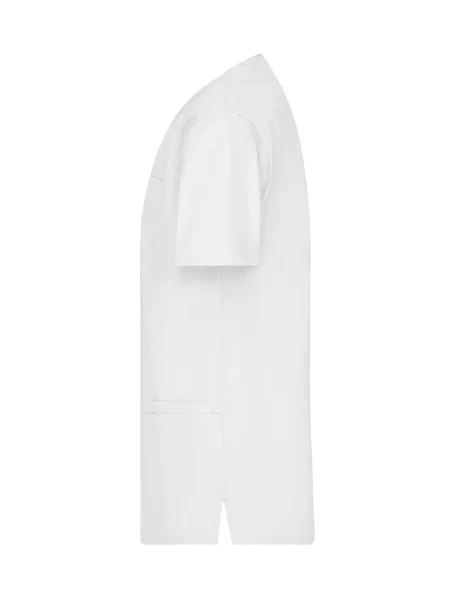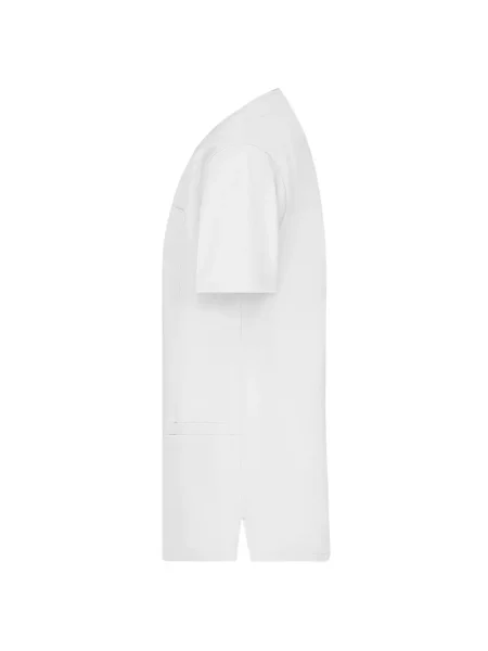 Camice da lavoro con collo a V. Pince fronte e retro, spacchetti laterali, 2 ampie tasche laterali, 2 taschini sul fronte, un taschino sul petto. Lavabile a 95%C.