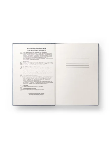 Block notes A5 con copertina semirigida fatta con gli scarti della buccia di caffé (65%) ed scarti di cotone (35%). La carta interna è fatta dagli scarti del cotone (100%) ed è altamente resistente. Contiene 120 pagine a righe e fascia in carta stampata. Non sono stati utilizzati processi chimici o alberi nel processo di produzione di questo block notes. Poiché il prodotto è realizzato con materiali naturali, il colore del prodotto e il risultato della stampa possono variare da un prodotto all'altro.