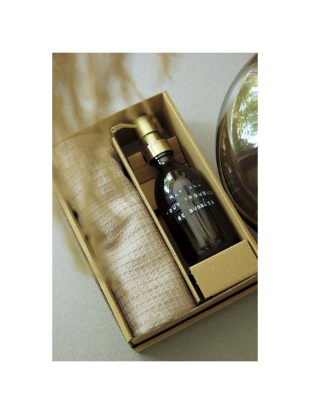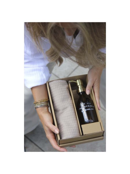 Set bagno regalo composto da un sapone mani da 250 ml con delicata fragranza di bambù e da un asciugamano beige in cotone biologico. Una proposta elegante e utile, ideale come dono adatto a qualsiasi occasione.