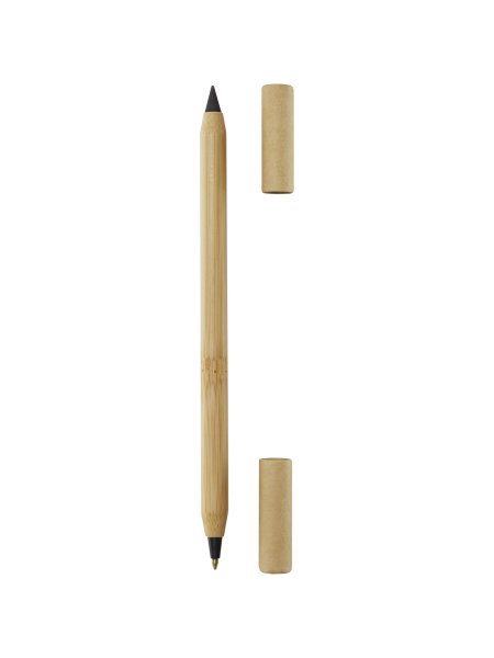 Il set di penne personalizzate bamboo Samambu offre un design innovativo con una penna dotata di due punte diverse: una penna a sfera e una penna senza inchiostro. Quest'ultima, particolarmente ecologica, elimina la necessità di cartucce d'inchiostro o ricariche grazie alla sua punta di grafite nera, capace di lasciare segni visibili su qualsiasi superficie di scrittura. Optare per una penna in bambù senza inchiostro non solo promuove pratiche sostenibili, ma sottolinea anche l'importanza dell'uso di materiali rinnovabili.