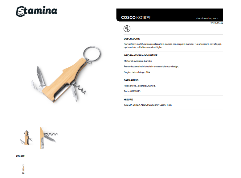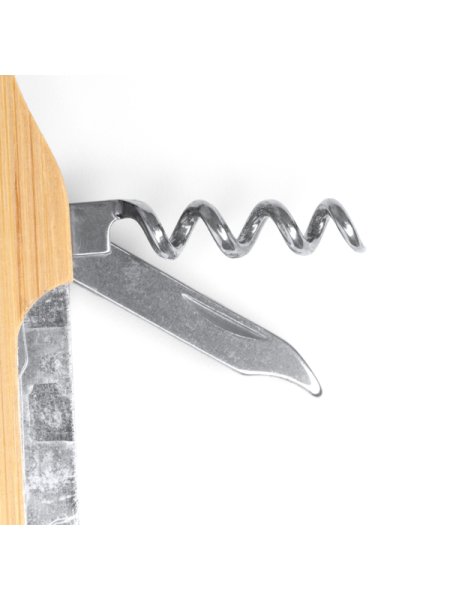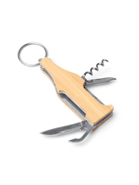 Portachiavi multifunzione realizzato in acciaio con corpo in bambù. Ha 4 funzioni: cavatappi, apriscatole, coltellino e apribottiglie.