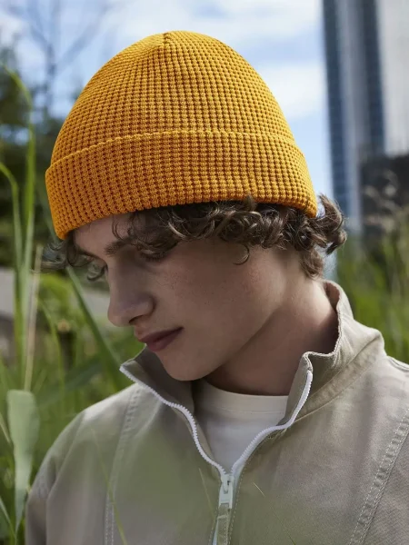 Cuffia invernale a maglia doppia con lavorazione a nido d'ape, realizzata in tessuto leggero e traspirante. Il modello presenta un risvolto per una finitura ottimale. Include un'etichetta removibile TearAway per facilitare il rebranding. Perfetta per comfort e stile.