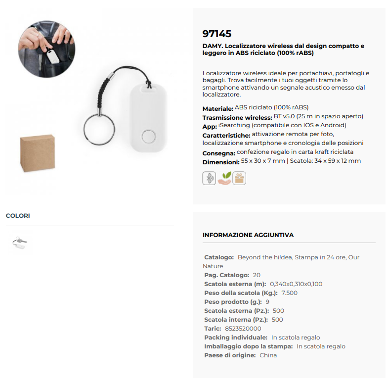 Il localizzatore wireless Bluetooth rABS è ideale per tenere sotto controllo chiavi, portafogli e bagagli in modo semplice e veloce. Realizzato in ABS riciclato al 100%, utilizza tecnologia Bluetooth 5.0 con una portata fino a 25 metri in spazio aperto. Tramite l’app iSearching, compatibile con iOS e Android, è possibile attivare un segnale acustico per ritrovare facilmente gli oggetti, localizzare lo smartphone, scattare foto da remoto e visualizzare la cronologia delle posizioni. Compatto e pratico, è fornito in confezione regalo in carta kraft riciclata, perfetto per un utilizzo quotidiano o come gadget tecnologico.