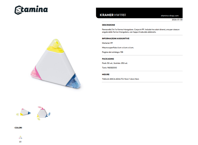 Pennarello 3 in 1 a forma triangolare. Corpo in PP. Include tre colori diversi, uno per ciascun angolo della forma triangolare, con tappo traslucido abbinato.