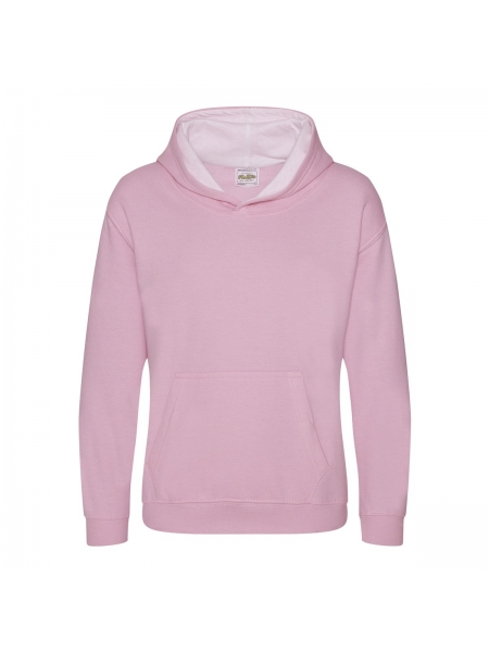 Felpa con maniche set-in, cappuccio a doppio strato con parte interna di colore contrastante, senza cordoncino, tasca anteriore a marsupio, polsini e orlo inferiore in costina, felpata internamente, struttura con cuciture laterali.