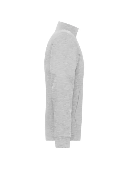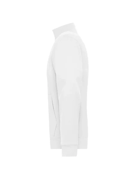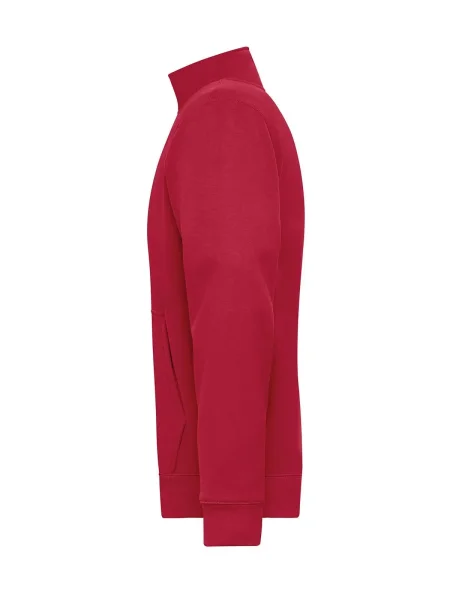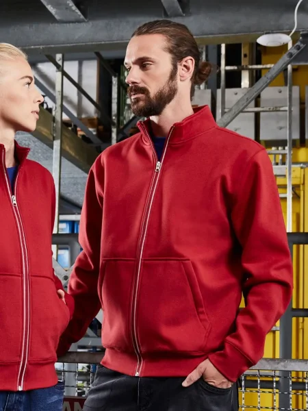 Felpa Men's Doubleface Work Jacket james & Nicholson. Felpa da lavoro in tessuto confortevole doppio strato, strato esterno in cotone single jersey, strato interno in pile, zip frontale riflettente (senza funzione protettiva / senza DPI), tasca a marsupio con zip nascoste YKK e polsini elastici.