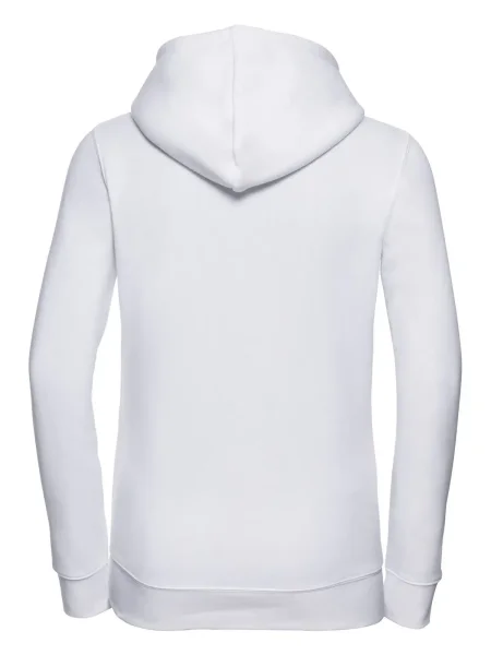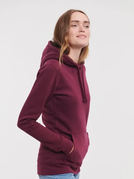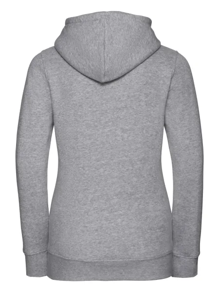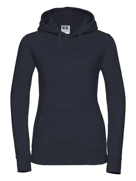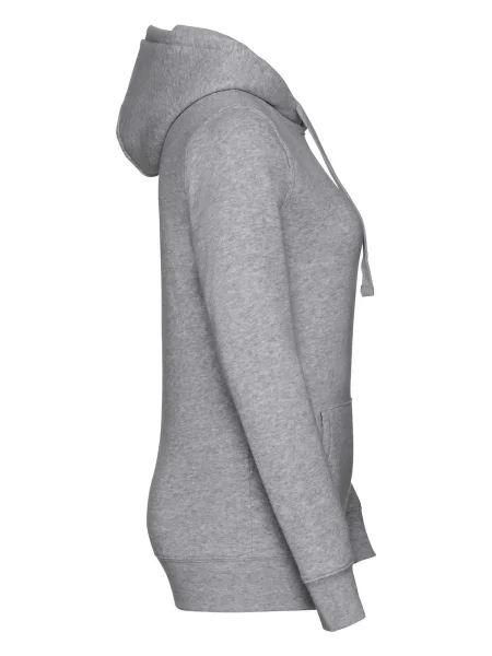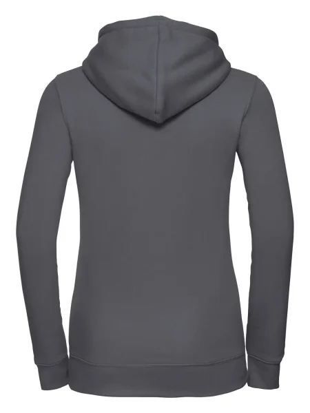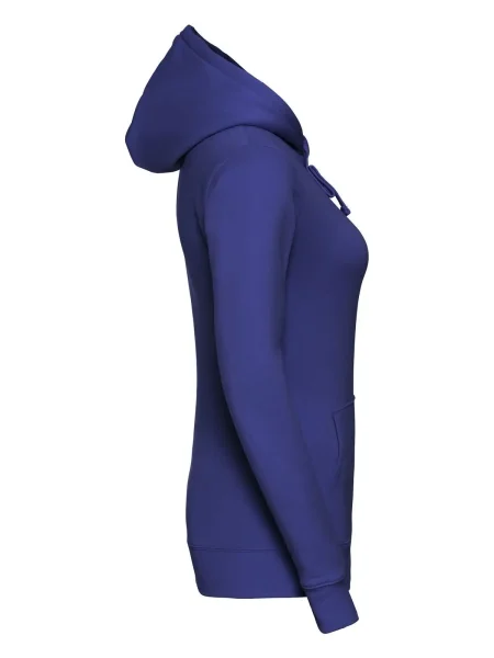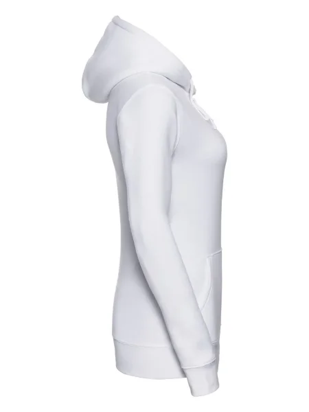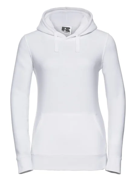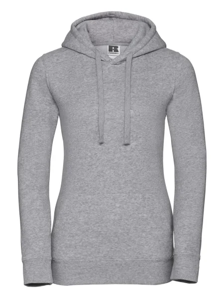 Felpa Ladies' Authentic Hooded Sweat Russel. Felpa con cappuccio a 3 strati, cordoncino piatto, leggermente sfiancata, struttura con cuciture laterali, nastro di rinforzo al collo, passanti per cuffie, maniche set-in, tasca a marsupio, felpata internamente.